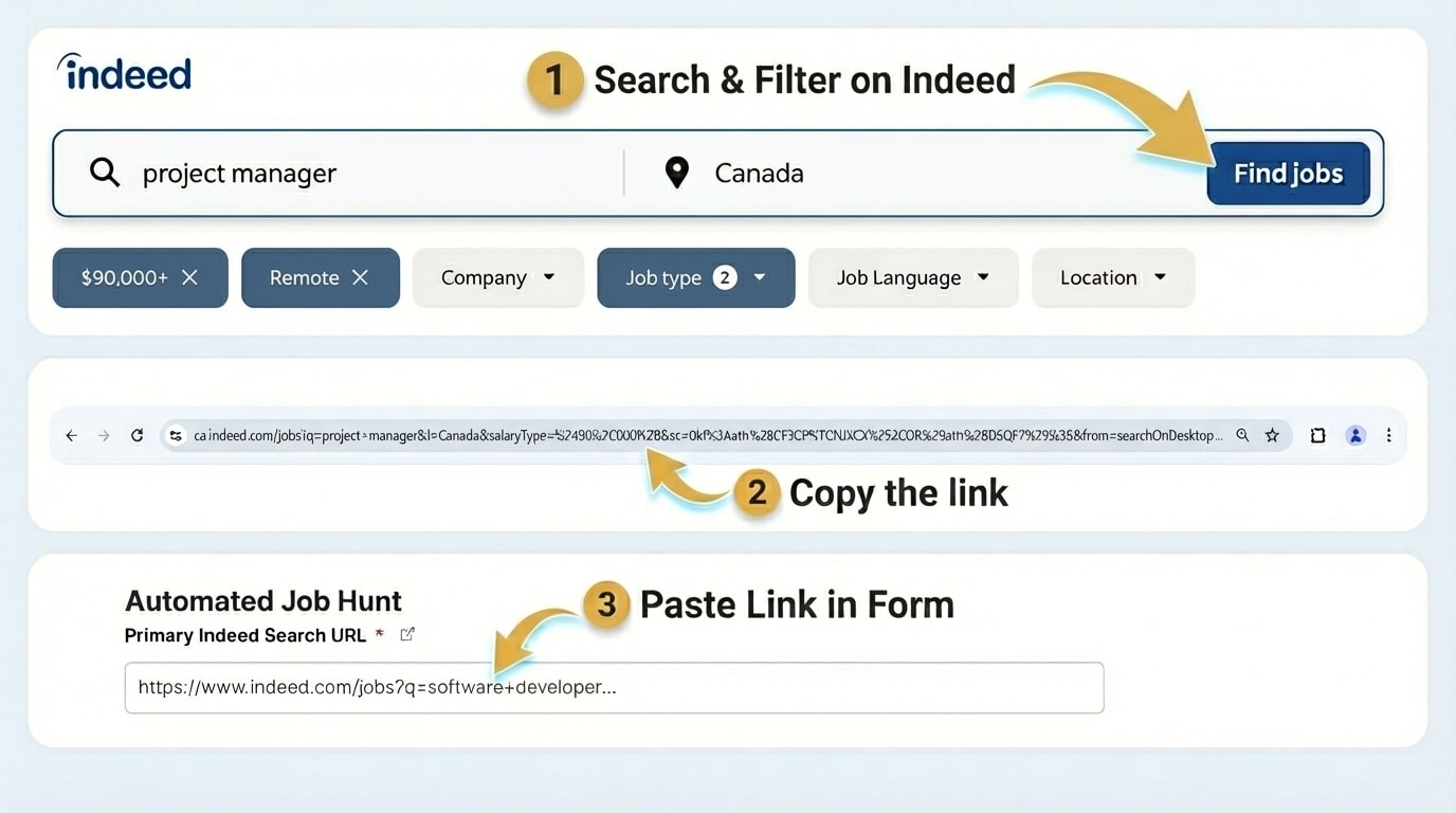 - Job search filters or keywords (e.g., “Focus on jobs in marketing” or “Only apply to remote roles”). These should be configured under your Job Hunt Profile, not here.